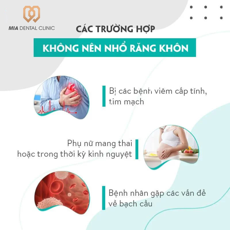 - Người mắc các bệnh về tim mạch hay một số bệnh liên quan đến thần kinh không nên thực hiện nhổ răng khôn vì có thể gây căng thẳng, lo âu, khiến bệnh nhân gặp nguy hiểm.